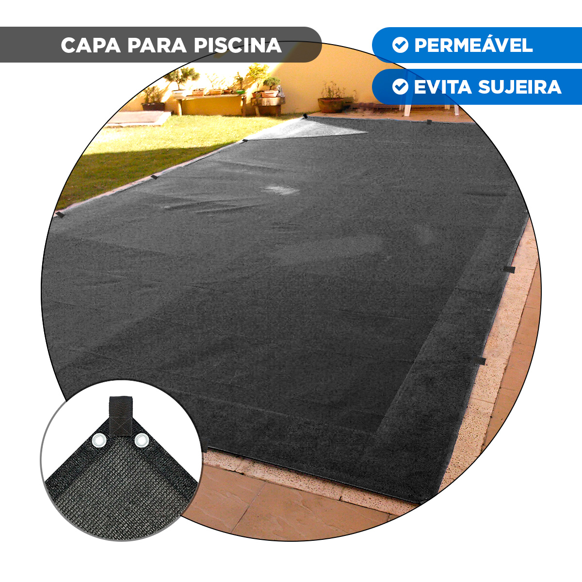 Opção Permeável de capa para piscina, onde não terá acúmulo de água e obterá proteção contra folhas e objetos medianos, mantendo a água limpa!